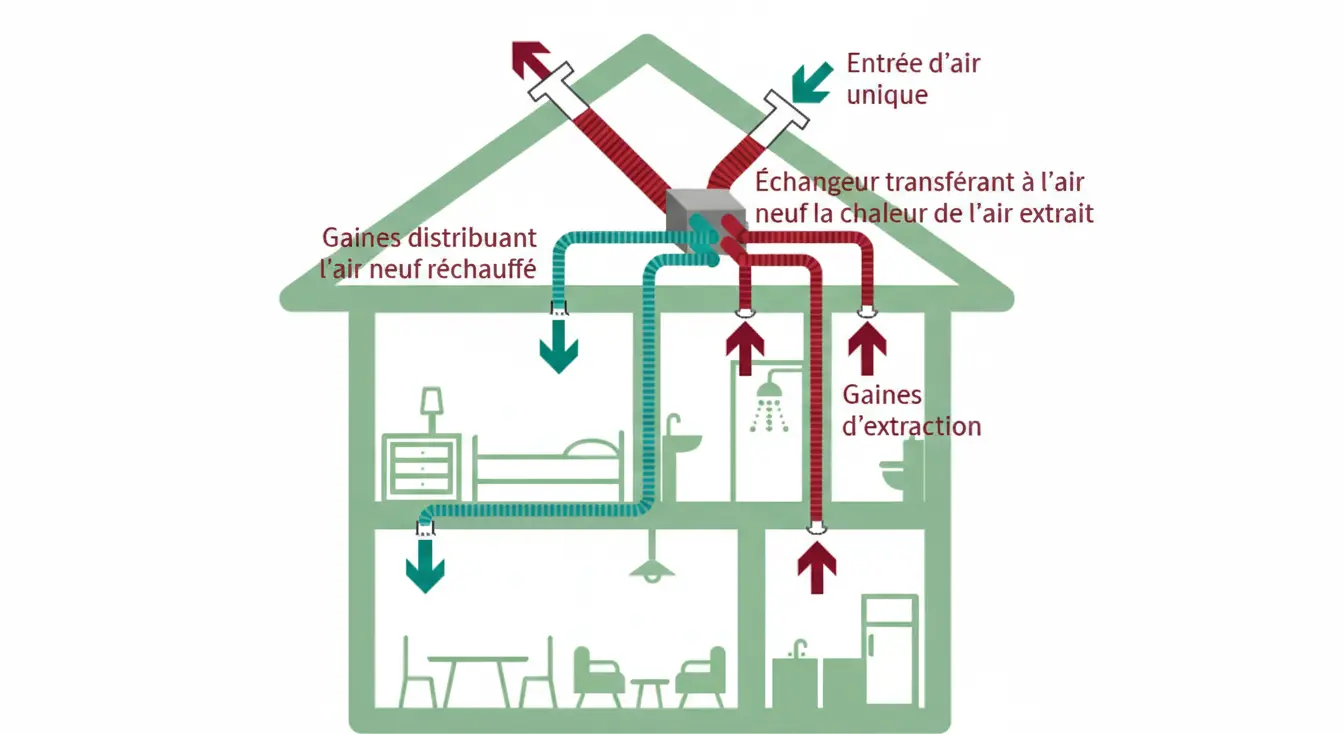 La VMC double flux assure le renouvellement d’air tout en limitant les pertes thermiques liées à la ventilation. Elle fonctionne avec deux circuits distincts : un pour l’extraction de l’air vicié et un pour l’insufflation d’air neuf.